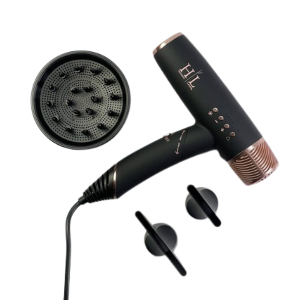 La Fierce Hairdryer es potencia profesional en tamaño compacto. Su motor brushless de alta velocidad (hasta 110,000 rpm) seca rápido sin quemar tu cabello, y su tecnología iónica deja el acabado suave, brillante y sin frizz. Incluye tres boquillas, diseño plegable para viajar, memoria de ajustes y un acabado negro soft-touch con detalles rose gold que se ve espectacular. Perfecta para blowouts diarios, cabello grueso o para quienes quieren una secadora bonita, pro y silenciosa.